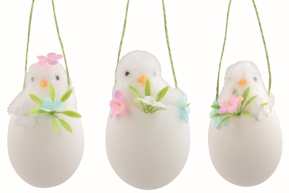 Kuře bílé ve skořápce, s dekoracemi, 6 × 11 × 6 cm, na zavěšení