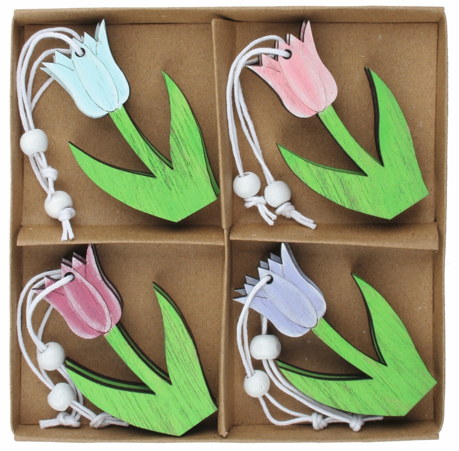 Květina dřevěná 3,5 x 6 x 0,5 cm na zavěšení, 8 ks v krabičce