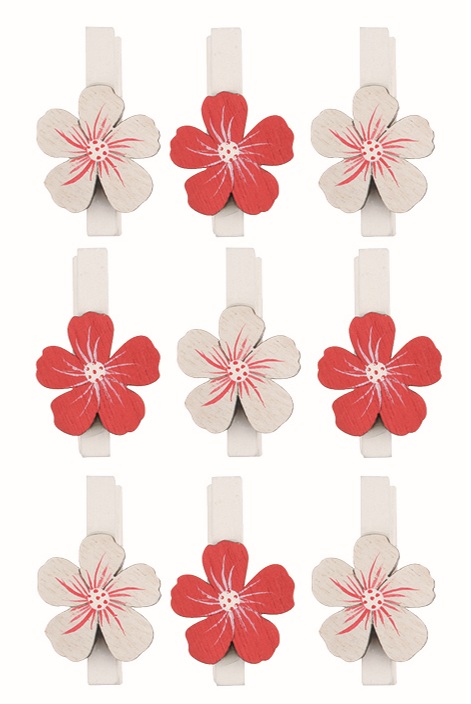 Kytka červená a bílá dřevěná 2,5 x 2,5 x 0,3 cm na kolíčku, 9 ks v sáčku