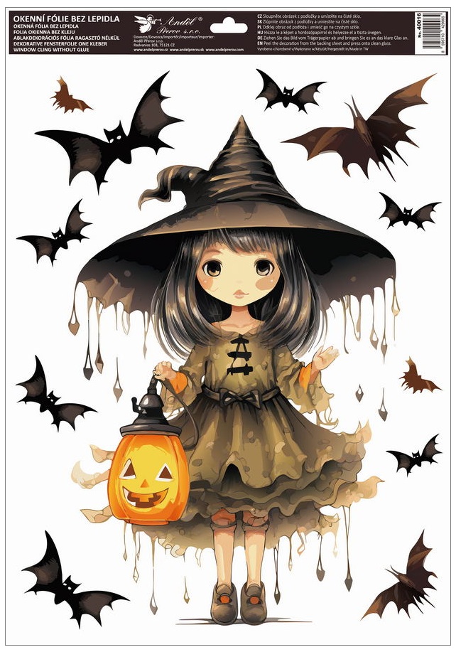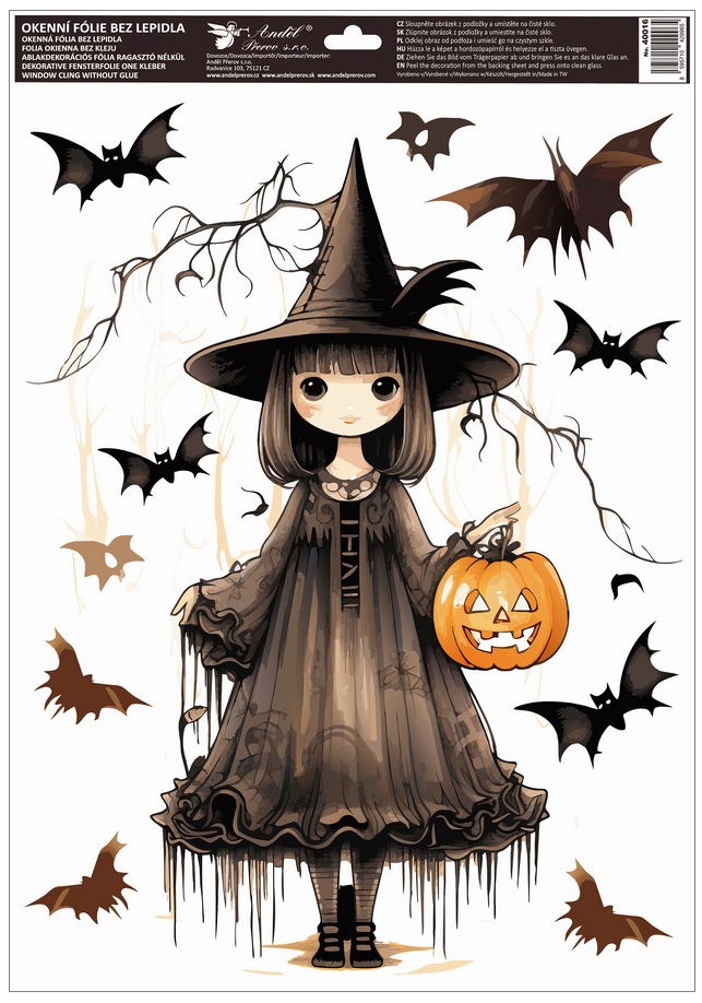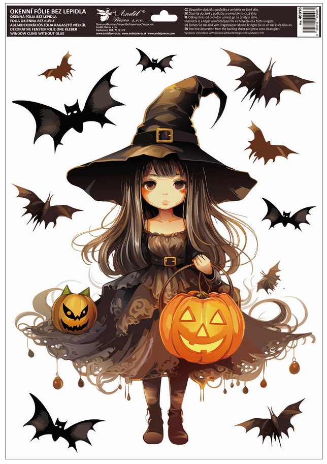 Dekorační okenní fólie s glitry s motivem strašidelně roztomilých čarodějek, dýní a netopýrů vnese do vašeho interiéru hravou a magickou podzimní atmosféru. Jasné barvy a třpytivé glitry zvýrazňují detaily motivu a dodávají fólii zářivý efekt, který krásně oživí okna, výlohy nebo skleněné plochy během podzimních a halloweenových dekorací. Fólie přilne elektrostaticky – bez použití lepidla, nezanechává stopy a je opakovaně použitelná.