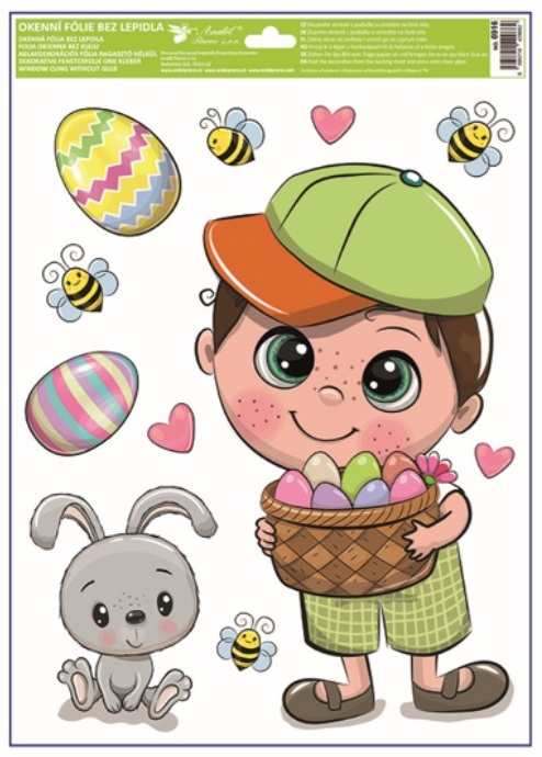 Tato dekorační okenní fólie s veselým velikonočním motivem postaviček, zajíčků a kraslic o rozměru 30 × 42 cm přinese do interiéru hravou a sváteční atmosféru. Přilne elektrostaticky – bez lepidla, nezanechává žádné stopy, snadno se aplikuje a je opakovaně použitelná.