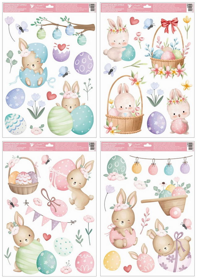 Motiv velikonočních zajíčků v kombinaci s pastelovými kraslicemi a jemnými jarními prvky působí hravě a veselě. Dekorace krásně vynikne na oknech, vitrínách i zrcadlech a díky třpytivým detailům dodá prostoru jemný sváteční lesk.