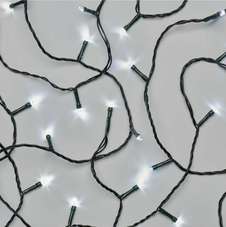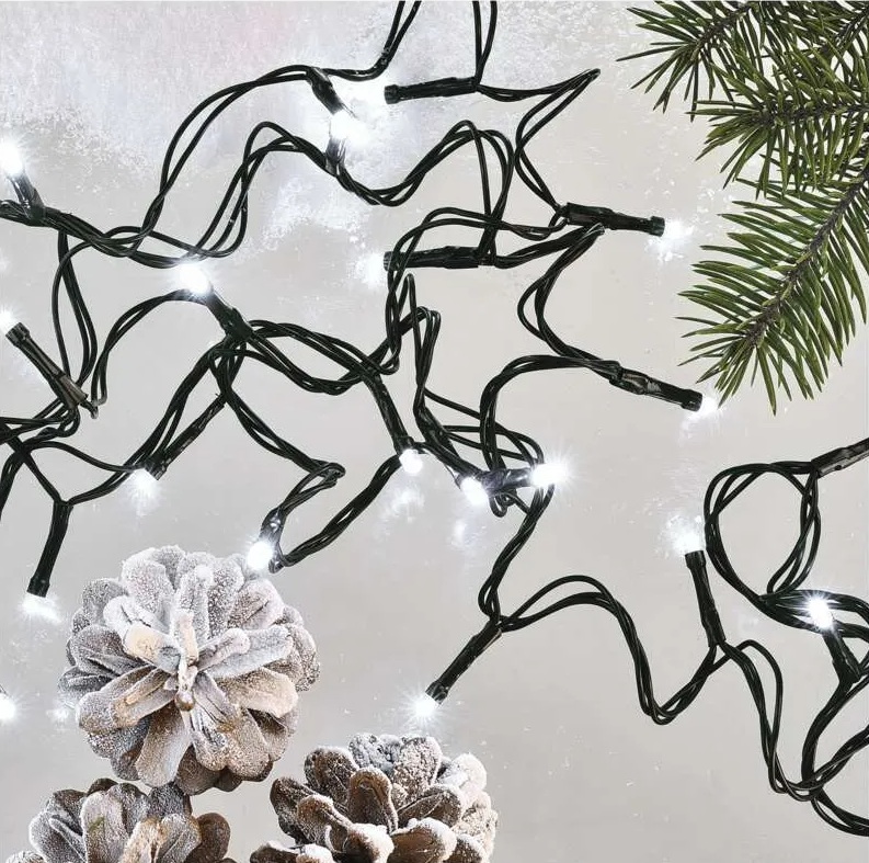 Světelný řetěz o délce 50 m s 500 jasnými LED v barvě studená bílá krásně zvýrazní stromek i výzdobu domu. Díky krytí IP44 je vhodný pro venkovní i vnitřní použití. Nabízí 8 světelných módů (multifunkce) a praktický časovač pro pohodlné automatické svícení. Zelený kabel splyne s větvemi a 5 m přívod usnadní napojení do zásuvky.