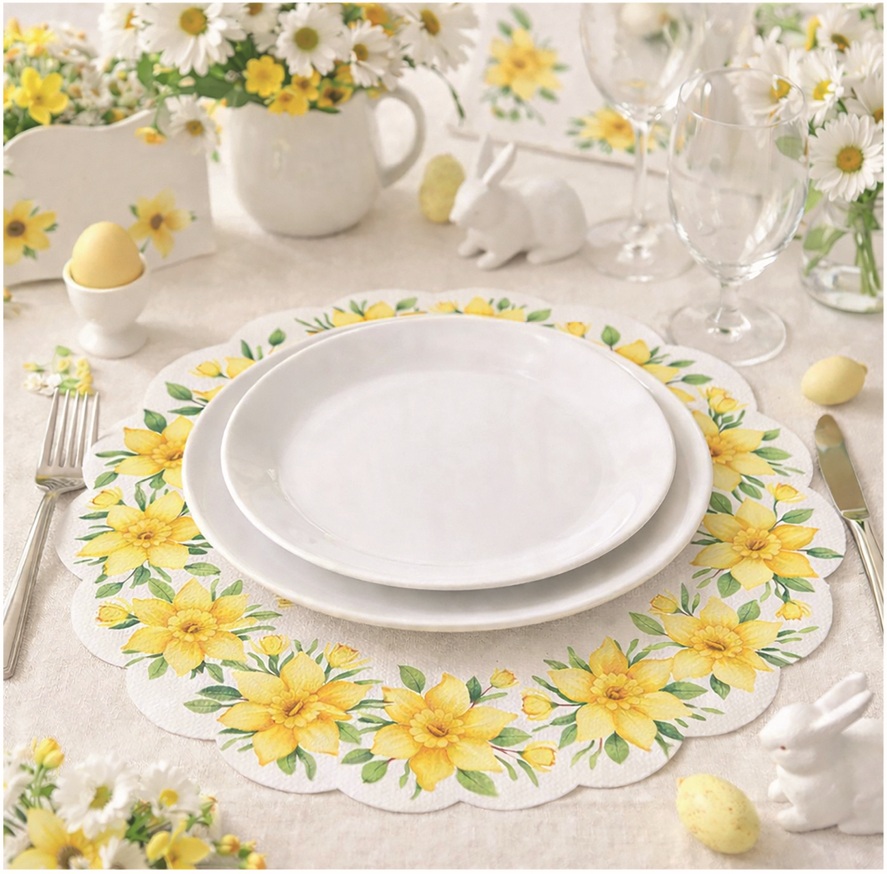 Elegantní kruhové papírové ubrousky s jemným jarním designem květů narcisu jsou stylovým a zároveň praktickým doplňkem pro slavnostní i každodenní stolování. Motiv narcisů přináší do prostřeného stolu svěží, veselou a přírodní atmosféru typickou pro jaro. Díky neobvyklému kruhovému tvaru s ozdobným okrajem působí ubrousky velmi dekorativně a lze je využít nejen při servírování jídel a nápojů, ale i jako efektní dekoraci pod talíře, svícny či jiné ozdobné prvky. Třívrstvé provedení zajišťuje pevnost, dobrou savost a pohodlné použití. Průměr 32 cm nabízí univerzální využití při různých typech stolování.