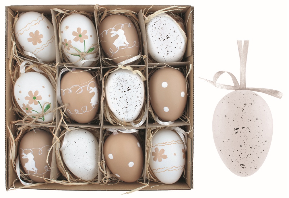 Sada velikonočních plastových vajec Bílá a krémová 6 cm na zavěšení, 12 ks v krabičce