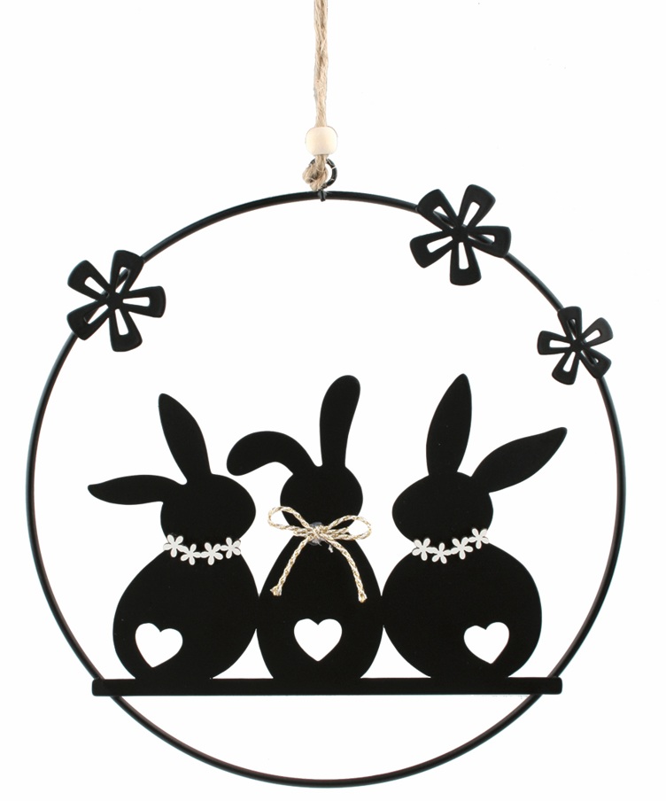 Kovová závěsná dekorace se třemi zajíci umístěnými v kruhu je originální a stylový doplněk, který vnese do vašeho domova hravý a přirozený jarní akcent. Tento minimalistický dekorativní motiv zachycuje siluety tří zajíců v kruhovém kovovém rámu — ideální pro sezónní i celoroční výzdobu. Díky očku a šňůrce na zavěšení ji můžete snadno umístit na stěnu, do okenního prostoru, na větev nebo háček a krásně ji zakomponovat do aranžmá. Kovový materiál dekoraci dodává lehkou eleganci a decentní vzhled, který se snadno kombinuje s ostatními dekorativními prvky vašeho interiéru.