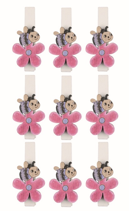Včelka na kytce fialová dřevěná 2 x 2,5 x 0,3 cm na kolíčku, 9 ks v sáčku