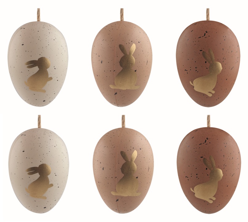 Velikonoční vejce plastová Zlatí zajíčci na hnědém 6 cm na zavěšení, 6 ks v sáčku