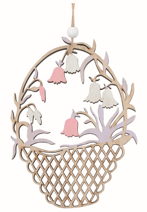 Vyřezávaný košík s fialovými květy dřevěný 11 x 15 x 0,5 cm na zavěšení